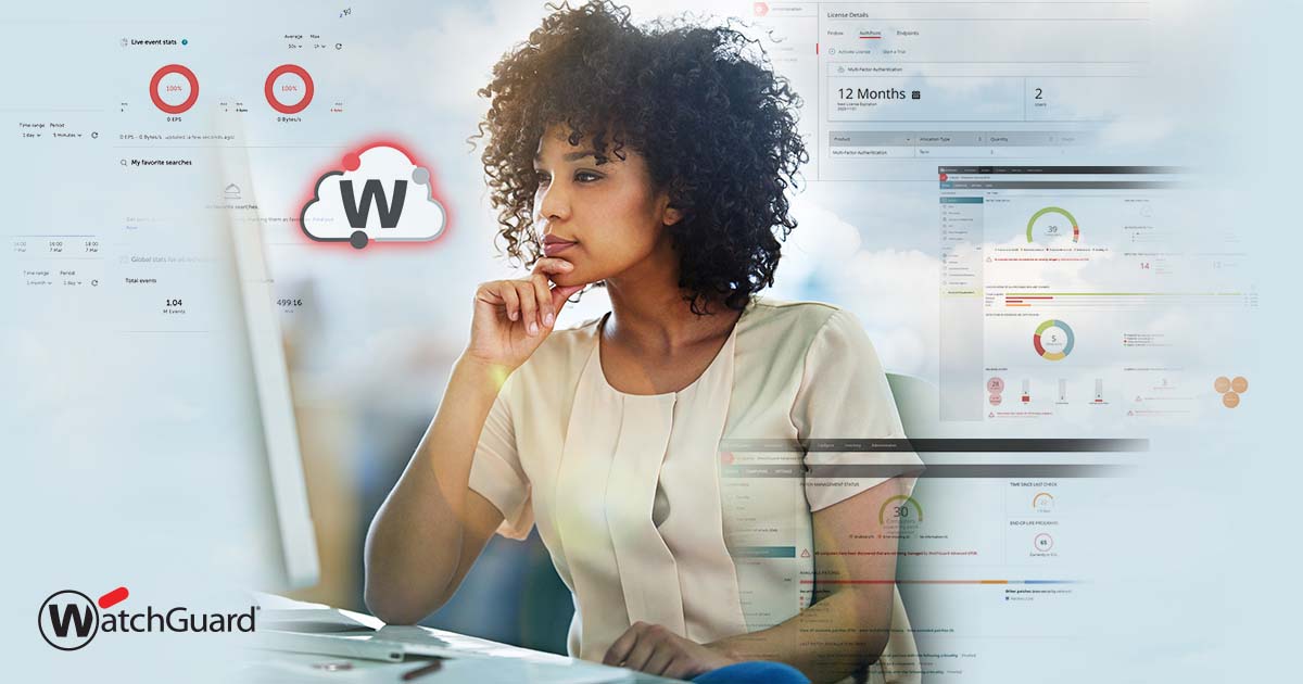 Schwarze Frau mit natürlich gelocktem Haar in einem weißen Seidentop schaut auf einen Monitor. Im Hintergrund sind WatchGuard Cloud-Bildschirme zu sehen.